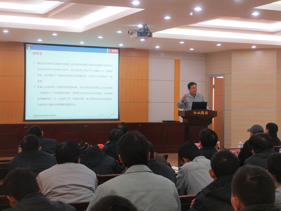 12月12日下午,杜邦安全改善項目年度審核末次會議在江山股份西區6號會議室召開。該公司總經理薛健發表重要講話。 12月8日至11日,杜邦審核老師對我公司杜邦安全改善項目進行階段性審核。本次審核依據的是杜邦安全管理系統的行為安全(安全文化機制)和工藝安全(風險管理機制)22要素審核清單。審核老師主要通過訪談、查閱、觀察三種方法了解公司當前的HSE管理現狀,并進行審核評分。