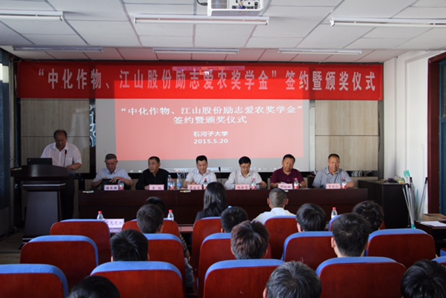 5月20日,由南通江山農(nóng)藥化工股份有限公司與中化作物保護品有限公司聯(lián)合捐助的“中化作物、江山股份勵志愛農(nóng)獎學金”簽約暨首次頒獎儀式在石河子大學農(nóng)學院隆重舉行。公司黨委副書記茅云龍、中化作物副總經(jīng)理王權(quán)、石河子大學校長助理楊新泉、農(nóng)學院黨委副書記艾尼瓦爾等校院領(lǐng)導以及校輔導員、學生代表參加了簽約及頒獎儀式。