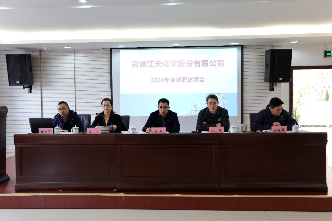 2月2日下午,南通江天化學股份有限公司2020年度領導班子述職考核會議在公司五樓大會議室召開。本次會議由公司黨支部書記陳梅主持,各部門負責人參加。產控集團黨委副書記成剛出席了會議。