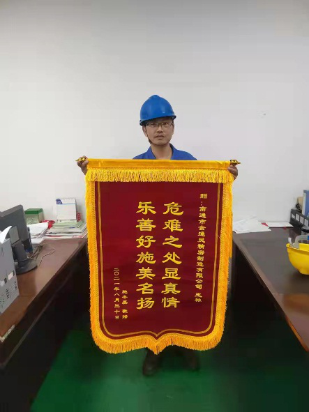 涓涓熱血,匯注生命希望,點滴真情,架起愛的橋梁。9月6日上午,金通靈精密制造有限公司迎來了一位特殊的客人——施先生,將一面寫著“危難之處顯真情,樂善好施美名揚”的錦旗送到我司三車間員工王棟手中,感謝他在緊急關頭無償獻血,幫助施先生的家庭重獲希望。