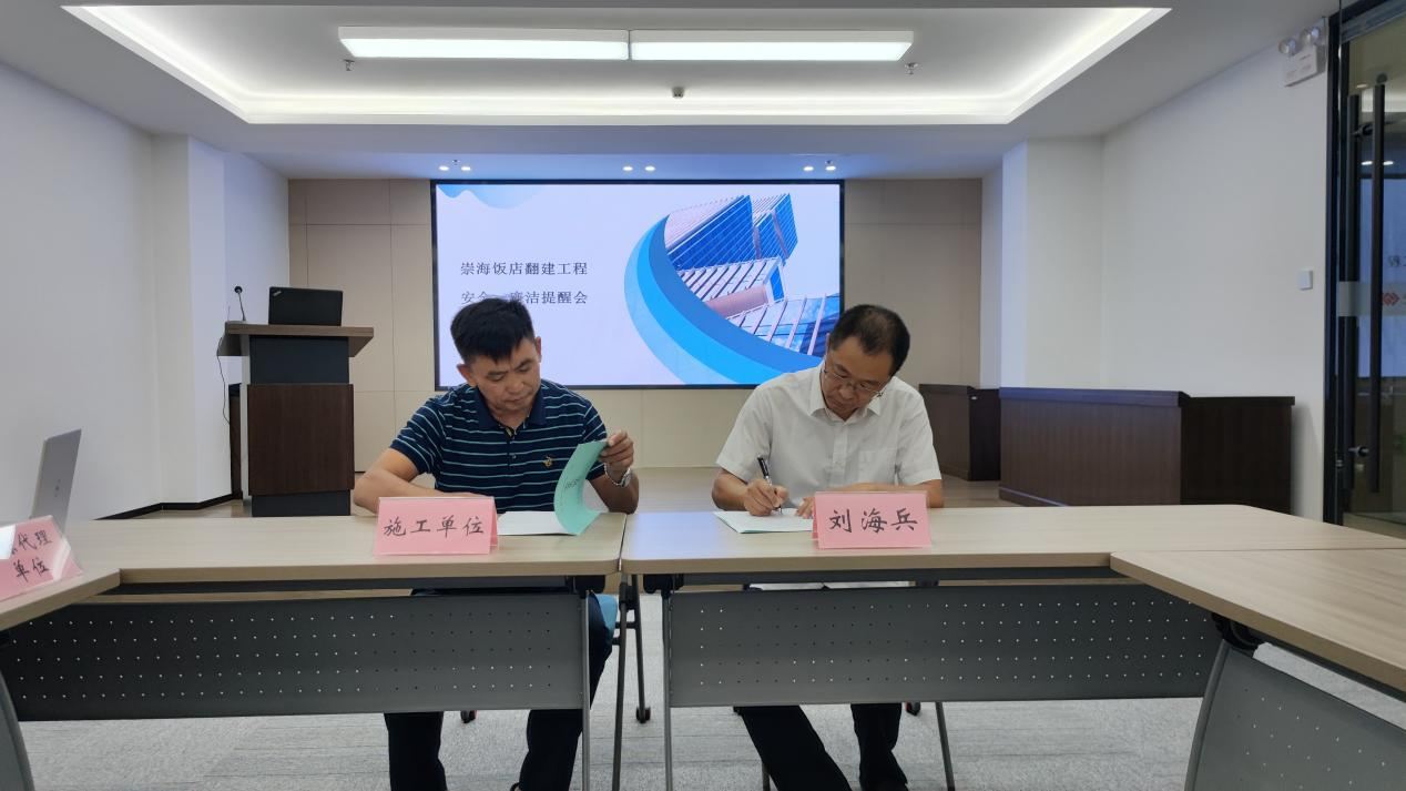 會上,國融公司黨委書記、董事長、總經理劉海兵向與會人員介紹崇海飯店翻建項目具體情況。國融公司與相關合作方簽訂安全責任書、廉潔責任書,項目管理人員簽訂廉潔承諾書。