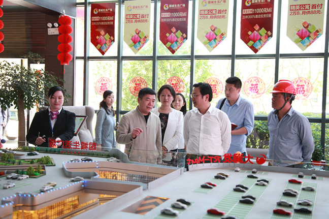 張市長一行饒有興趣地參觀駐足在國城生活廣場售樓處展廳沙盤前,仔細查看了項目平面功能布置,聽取了國城公司領導的情況匯報。他在對項目建設工作給予充分肯定的同時,指出觀音山新城作為市區的新興板塊,中心城市新的增長,及承載著城市轉型升級的重任。國城生活廣場作為市政府規劃觀音山新城區重點建設項目,國城公司要充分利用政府提出 “大眾創業、萬眾創新”理念這一有利契機,認真研究,借鑒相關商業地產、市場經驗,科學把握業態布局,改進營銷手段,在帶動區域人氣的同時,確保健康發展,為全市經濟發展注入新的活力。